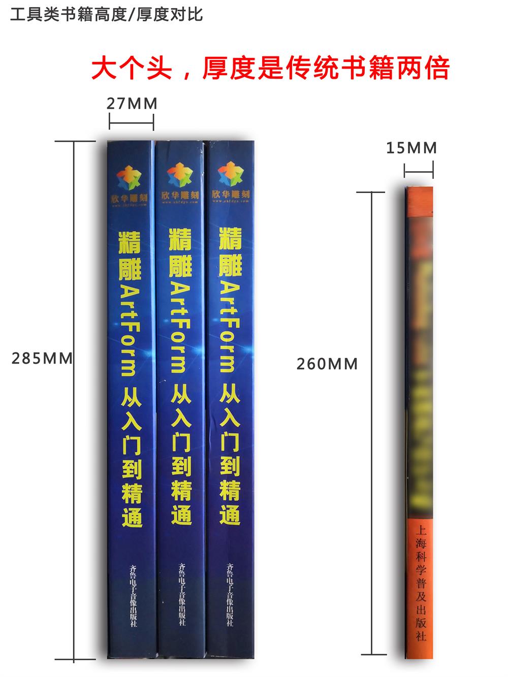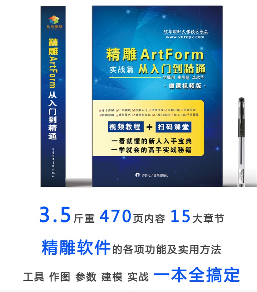 总结:《精雕ArtForm从入门到精通》是一部470页,重达3.5斤的大块头雕刻书籍,内容充实,讲解详 细,适合雕刻从业者细细品读。作者为欣华雕刻大学校区资深讲师,多年从事一线雕刻软件教学培训工 作,设计、教学经验丰富。大量的经验技巧融在书中,可以提高学习效率,让读者少走弯路。因此本书 值得五星推荐。
