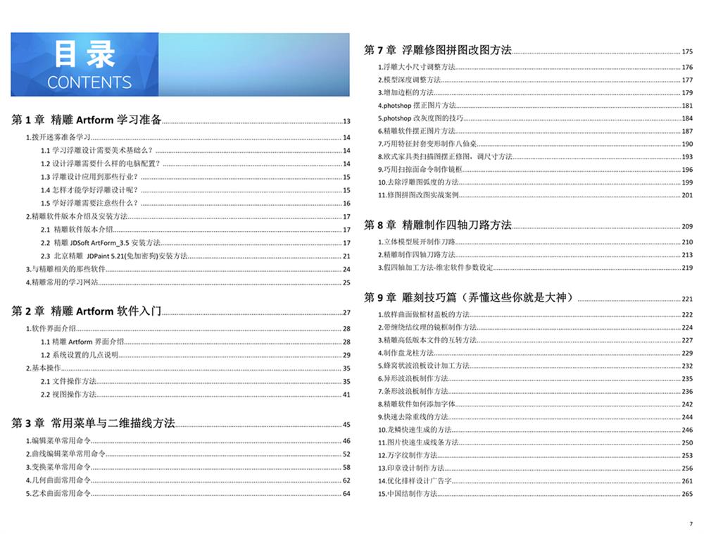 后续的第10章至第14章,分别从精雕ArtForm软件新增命令,雕刻机的操作维护,雕刻加工刀具的使用, 雕刻加工刀路的制作,常见问题答疑等方面详细讲解了从设计到加工这一流程中所涉及的各个环节知识。 海量的知识,需要花费大量时间精读学习,学好这些内容可以帮我们在后续的加工中更加得心应手。